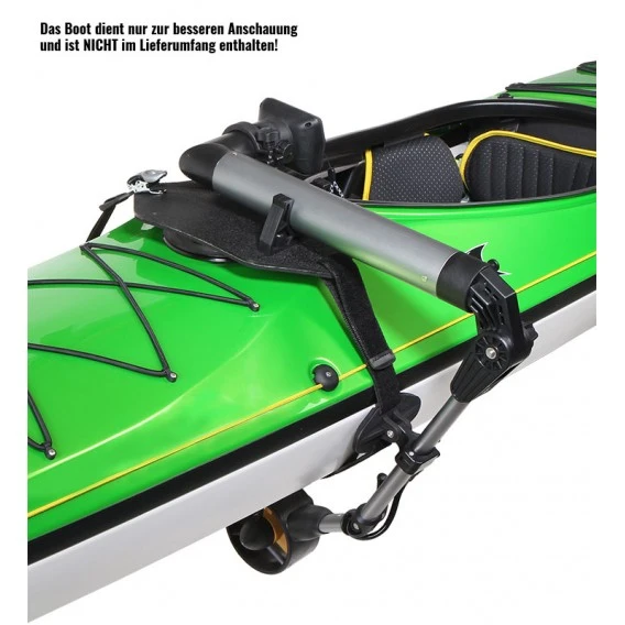 Kajaks mit diesem Antrieb sollten mit einer Steueranlage ausgerüstet sein. Bei Kajaks ohne Steuer, SUPs und Kanadiern muß mit dem Paddel gesteuert bzw. die Richtung gehalten werden! Maximaler Bootsumfang: 215 cm.